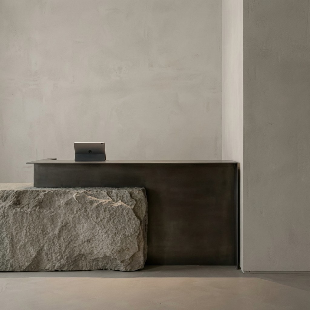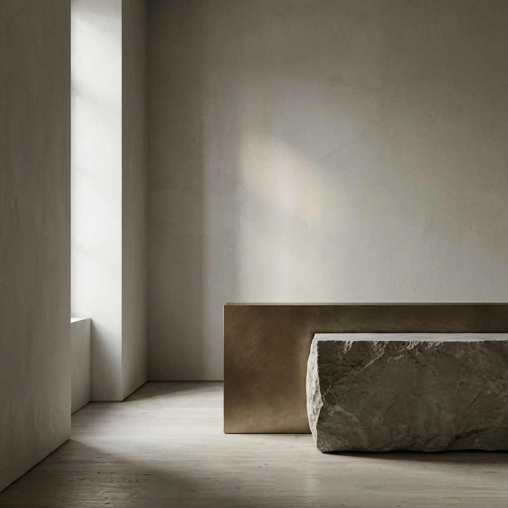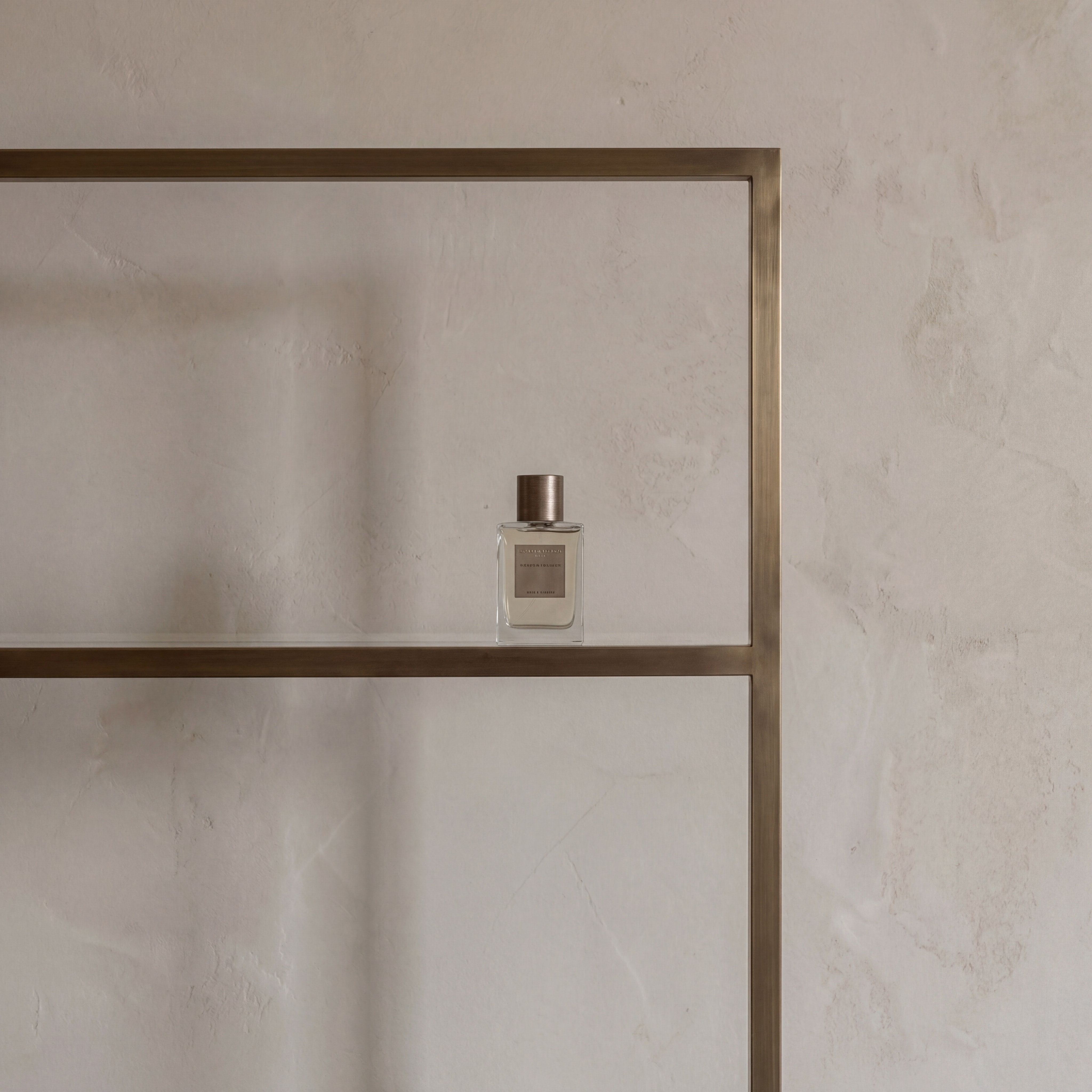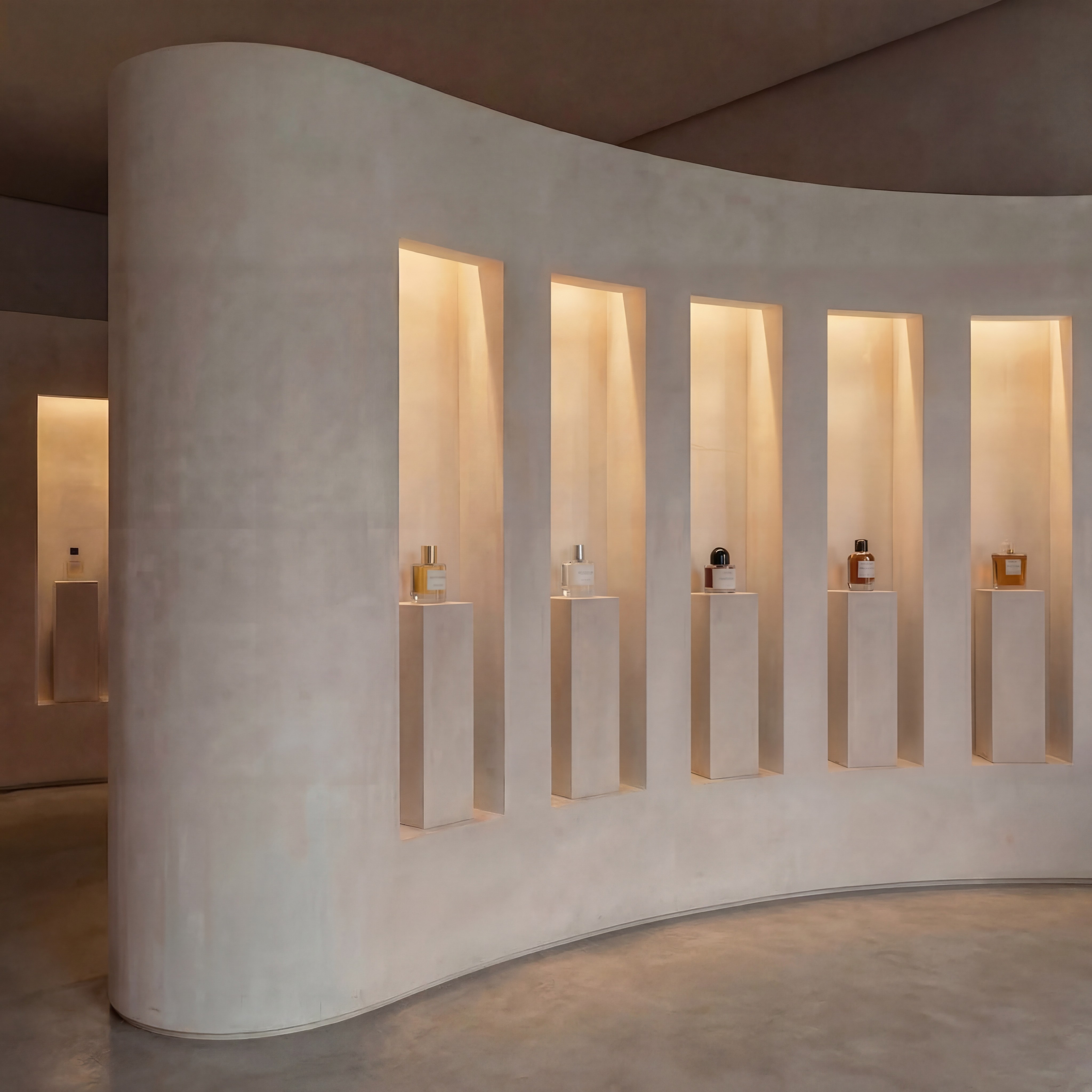 Il progetto nasce come spazio di sottrazione. L’ambiente è definito da superfici minerali continue, luce naturale filtrata e volumi monolitici in pietra. Ogni elemento è ridotto all’essenziale per lasciare che sia il prodotto a costruire la narrazione. Le essenze e gli oli locali sono presentati come oggetti da contemplare, non da accumulare. Piccoli flaconi trovano posto in nicchie illuminate o su basamenti scultorei, isolati nello spazio per amplificarne la presenza. Il banco centrale, monolitico, diventa luogo di incontro e racconto. Non esposizione, ma gesto lento: annusare, toccare, ascoltare. La palette è costruita su toni chiari e caldi — pietra, sabbia, ottone satinato — per creare un’atmosfera raccolta ma luminosa. La luce naturale entra in modo radente, disegnando ombre nette che cambiano durante la giornata. Lo spazio commerciale si trasforma così in esperienza sensoriale. Un luogo dove il tempo rallenta e la percezione si affina.